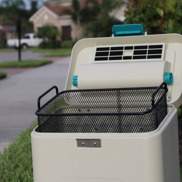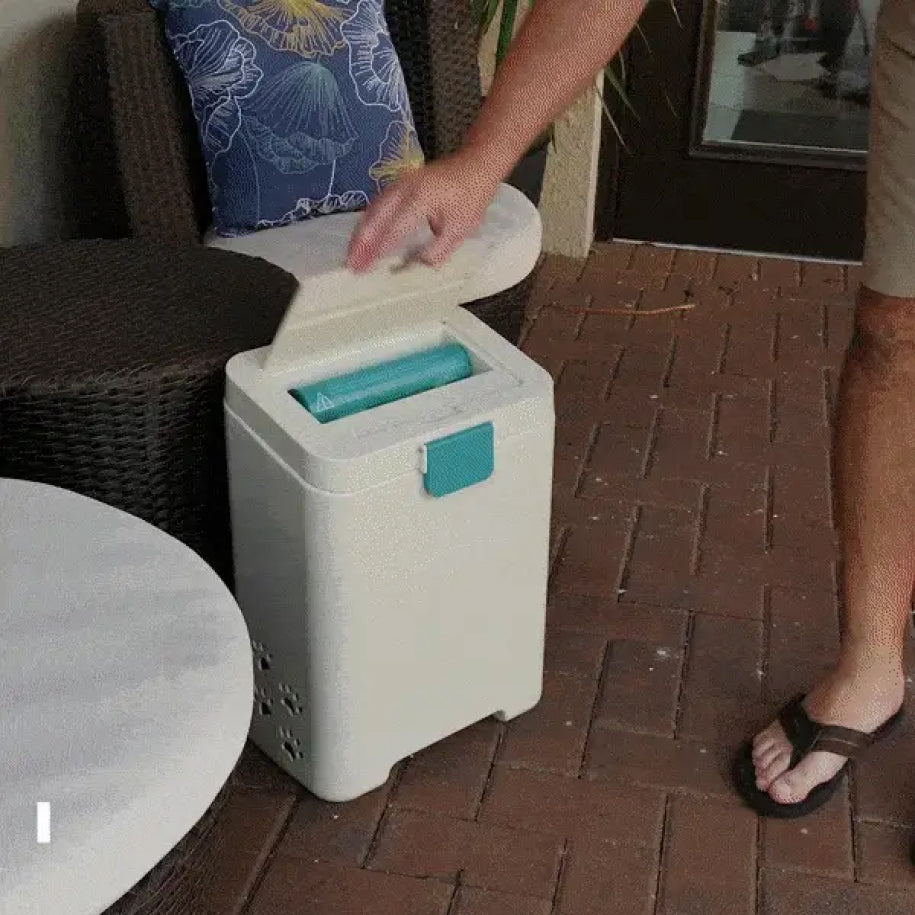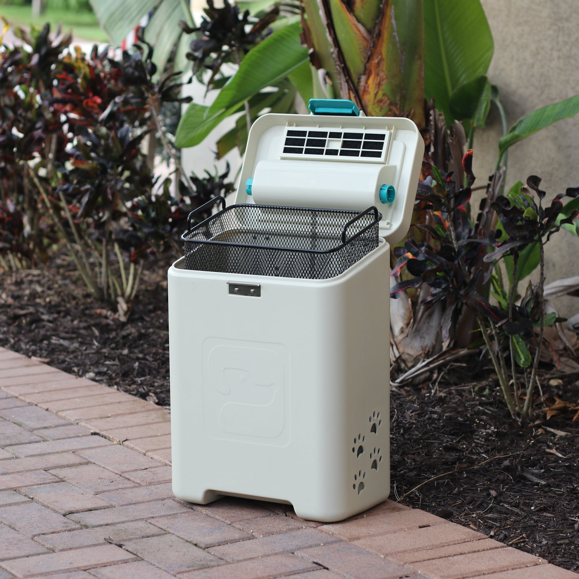 - An Activated Carbon Air Filter traps harmful odors from the air inside the pet waste station